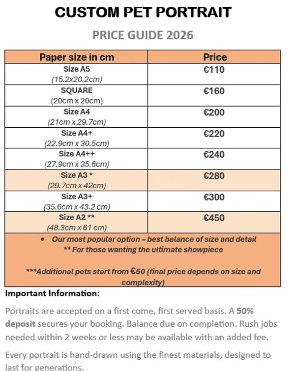 Each portrait is drawn with great care and attention to detail, bringing your pet's personality to life. Choose the size that best suits your space and how you'd like to display your artwork - from a small keepsake to a statement piece for your home.
